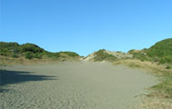 平砂浦海岸から吹き上げられた砂で形成された天然砂丘「通称:砂山」。ソリやサンドボードが楽しめる、ちょっと変わったナチュラルスポットです。風の強さや、風向きによって傾斜に変化が加わるので毎回行くたびに違うコースになっています。リフトがないため、頂上までは砂に足をとられながらも自力であがっていくしか方法はありませんが、サラサラな砂の上を一気に滑走する醍醐味は、雪の上を滑るスキーや、スノーボードとはまた違う感覚で、とてもスリリングかつ爽快です。整備さた駐車場はありませんが、3台くらい駐車できるスペースはあります。