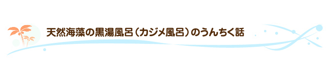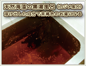 海藻を使ったお風呂・・・今までに入ったことはありますか? 館山では昔から漁師さんや海女さんたちの間で親しまれてきました。 「熱い湯加減じゃなくとも良く温まり、長時間にわたって湯冷めしない」 これが海藻風呂の特徴です。漁で酷使し、冷えきった身体を優しく温めるのにもってこいのお風呂だった訳です。 通称「カジメ風呂」というのが地元では一般的ですが、当館では開業時より「天然海藻の黒湯風呂」と称し、ご提供させていただいております。お風呂を目当てに遠方よりリピートしてくださるお客様もおり、おかげさまで今日に至るまで多くの御支持を頂戴してまいりました。