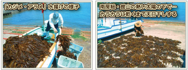 環境省が実施する「海水浴場水質調査」において、水質が最高レベルの「AAランク」と認定されている、鷹ノ島~沖ノ島にかけて 自生繁殖した海藻(カジメ・アラメ)を提携している漁師さんに収穫してもらっています。収穫した海藻はキレイに洗浄し、 3日間ほど天日干しにして完全に水気を飛ばします。乾燥してカラカラの状態になったら「素」の完成です。 いたって単純な作業なのですが、この間に雨や露などの湿気が発生してしまうと、海藻の貴重な成分が一気に溶け出してしまうため、干している期間は一時たりとも気が抜けません。 添加物や着色料・香料などは一切使用しない天然100%にこだわっています。 そのため、湯船に漂う潮の香りが若干鼻につく方もいらっしゃるかと思いますが、栄養豊かな海で育った素材本来の香りですので、「まぁ、そう云うものか・・・」とご堪能いただけましたら幸いに思います。