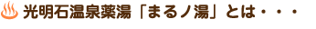当館の風呂「まるノ湯」は、薬石の「光明石」を沈めた人工温泉に加え、生薬(生薬由来成分/医薬部外品)が溶け込んだお湯となっております。 「温泉成分×生薬成分」の相乗作用により、血行を促進し、日々の疲れ、ダルさ、肌のダメージ、メンタル面を優しくケアします。温泉の泉質自体は、無色透明であり無味無臭ですが、生薬成分により、お湯の色が「緑がかった渋い茶褐色」となっています。また、ほんのりと生薬の自然な香りを感じていただけます。 人工温泉と聞くと、天然温泉に“劣る”イメージをもたれる方も居るかと思います。当館が湯船に用いている「光明石」は、専門研究機関による分析検証の結果に基づき、厚生労働省が承認した「薬石」です。その「光明石」から溶出した成分・泉質は、天然温泉の「弱アルカリ性単純温泉」と同等、またはそれ以上の効果が期待できます。 家庭用の小さな風呂ですが、温泉薬湯で癒しのヒトトキをお楽しみください。
