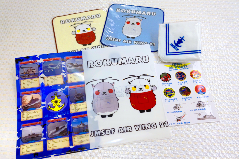 ろくまるグッズ・海上自衛隊ハンドタオル・クリアファイル等。