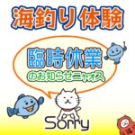 平素より格別のお引き立てを賜り、厚く御礼申し上げます。 「2023年11月18日(土)」の「海釣り体験@レンタル釣り竿サービス」を臨時休業させていただきます。 海況不良(強風)が予想されるため、安全面を考慮しの措置となり […]