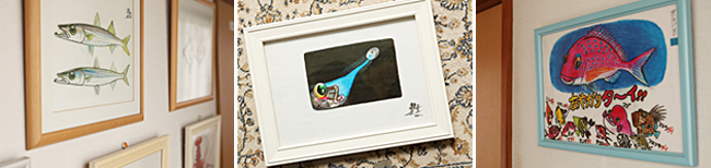 また、館内廊下には当館と仲良しの「さかなクン」が提供してくれた「可愛らしい魚のイラスト」をずらりと飾ってあり、ちょっとしたギャラリーのようになっています。当館自慢のコレクションです。是非ご覧になってくださいね♪